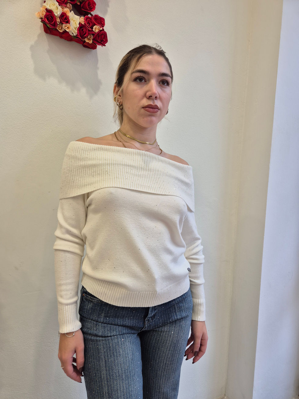 Meraviglioso maglioncino con scollatura a barca. Totalmente impreziosito da mini paillettes argento. Taglia unica. Vestibilità da XS a L