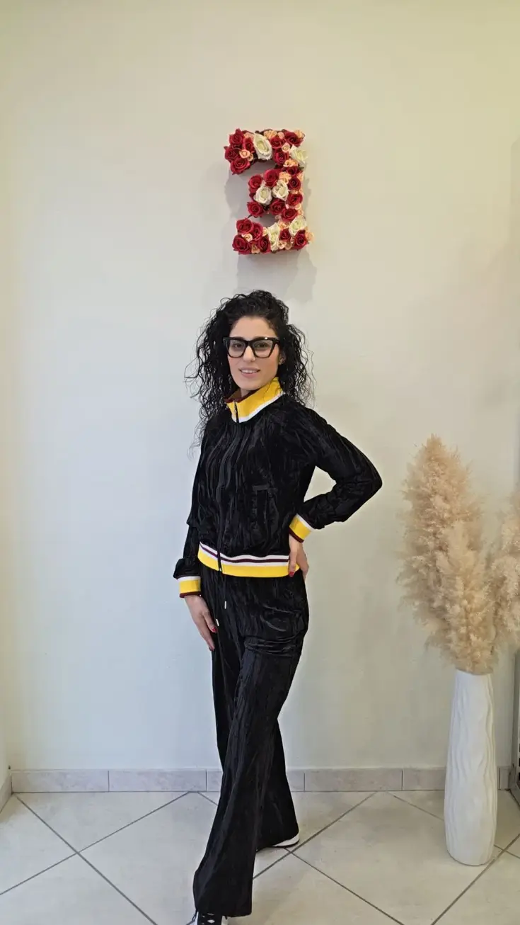 Completo tuta intera ciniglia con dettagli in felpa su collo,polsini e vita. Completo composto da felpa con zip centrale e tasche. Pantalone palazzo con coulisse in vita e tasche